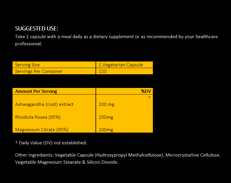 Ingredients: Ashwagandha, Rhodiola, Magnesium Citrate