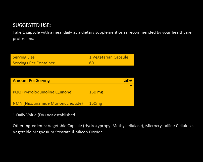 Ingredients: PQQ (Pyrroloquinoline Quinone), NMN (Nicotinamide Mononucleotide).
